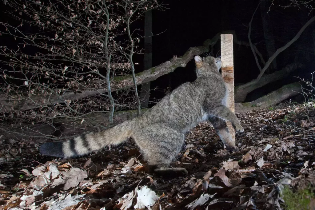 In Hessen leben schätzungsweise wieder über 1.000 Wildkatzen. Einst durch massive Bejagung fast ausgerottet, steht die Art heute unter strengem Artenschutz und kann sich langsam wieder ausbreiten. Damit dies auch weiterhin passieren kann, wertet der BUND im Projekt „Wildkatzenwälder von morgen“ mit gezielten Maßnahmen im Wald die Lebensräume der Wildkatze auf. Dies trägt gleichzeitig dazu bei, Wälder artenreicher und widerstandsfähiger gegen den Klimawandel zu machen. Außerdem möchte der BUND Verbreitungslücken mithilfe von Lockstockuntersuchungen schließen. Dabei bringen freiwillige Helferinnen und Helfer Holzstöcke in Gebieten aus, in denen die scheue Wildkatze vermutet wird und besprühen diese mit Baldrian. Der Geruch ist den Sexuallockstoffen der Wildkatze sehr ähnlich und zieht die Tiere magisch an. Die Katzen reiben sich am rauen Holz und hinterlassen Haare, die von den Helfer*innen abgesammelt werden. Anschließend werden die Proben für eine genetische Untersuchung zur Senckenberg Gesellschaft für Naturforschung nach Gelnhausen geschickt.